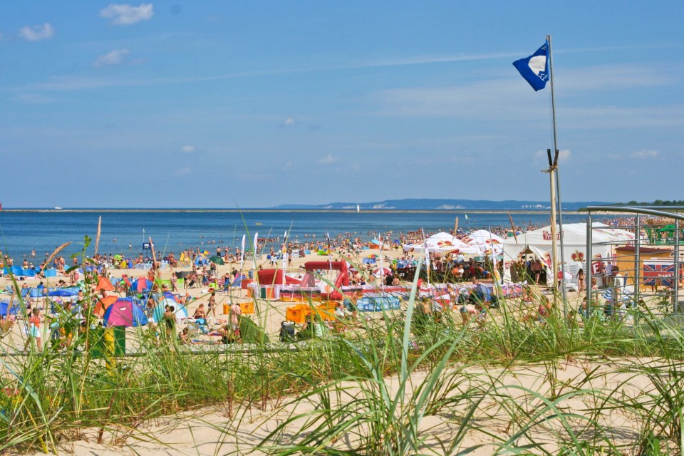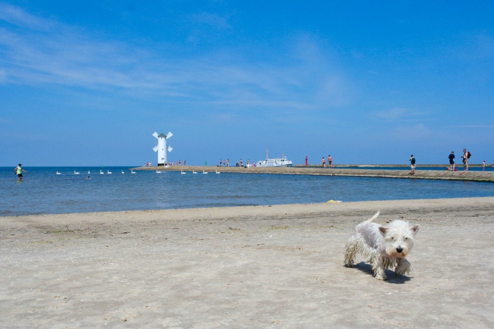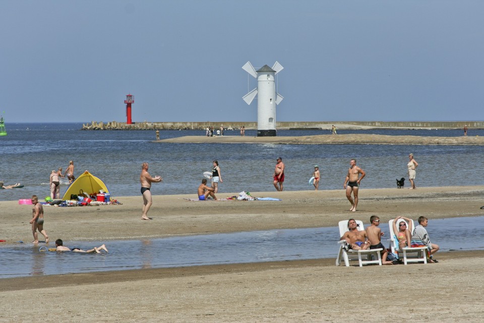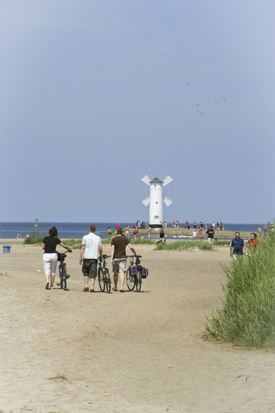 W granicach Świnoujścia znajdziemy aż 10 kilometrów pięknych, piaszczystych plaż, łagodnie wchodzących w morze, tworząc obszerne, płytkie kąpieliska. Na liczne wyznaczone kąpieliska prowadzi z miejscowości 12 wejść, a szerokość plaż dochodzi miejscami do siedemdziesięciu metrów. Czystość plaż i okolicy została doceniona i Świnoujście szczyci się certyfikatem "Błękitnej Flagi". Brzeg morski od miejscowości oddzielają szerokie wydmy. Na plaży, poza obecnymi wszędzie nad morzem mewami, spotkamy, czekające na okruchy białe łabędzie. Przy plaży, na końcu Falochronu Zachodniego w Świnoujściu znajduje się charakterystyczna Stawa Młyny.